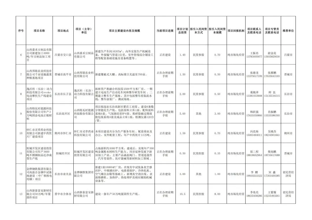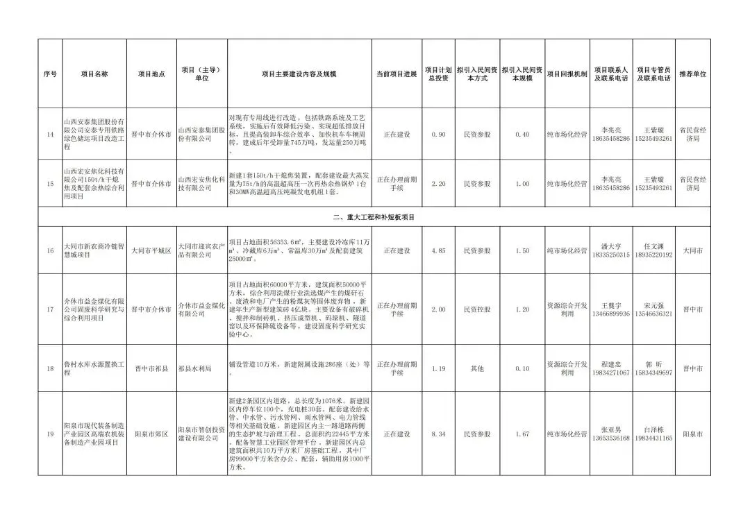 位于我市的项目中有2个产业类项目。太药控股(山西)集团有限公司国际创新药研发、生产和物流基地项目,主要进行生物制剂厂房、国际化标准的高端综合制剂厂房、5G+智慧医药物流园的建设。山西承信新能源科技装备有限公司先进低碳矿用防爆车产业化项目,设总部基地,打造集研发、制造、销售、维修功能于一体的高端装备产业园。