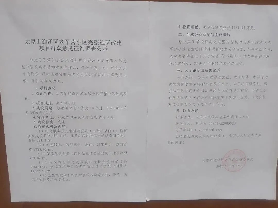 近日,张贴在太原市老军营小区里一纸通知引起住户议论纷纷,根据中央、省、市相关文件的要求,将对太原市迎泽区老军营小区完整社区改建。