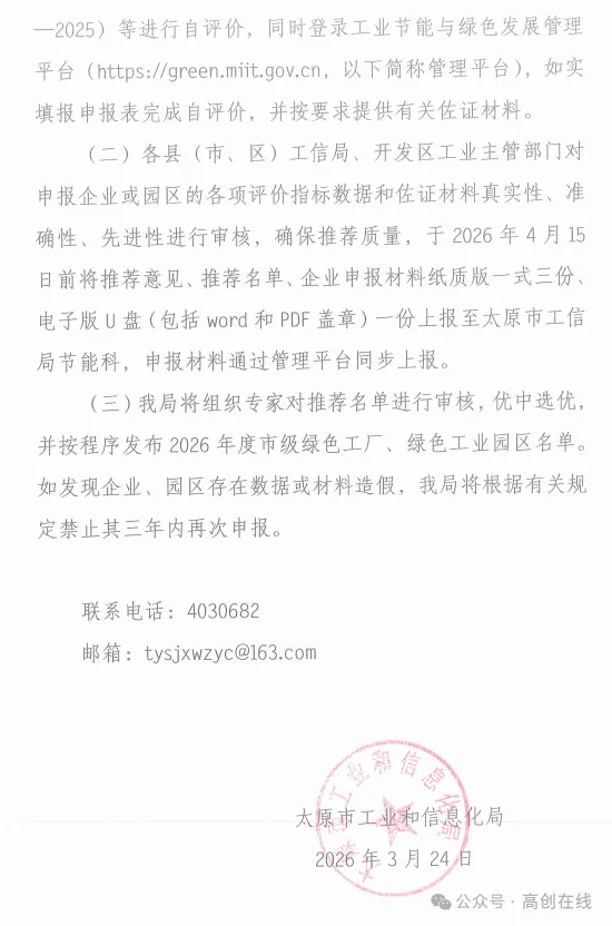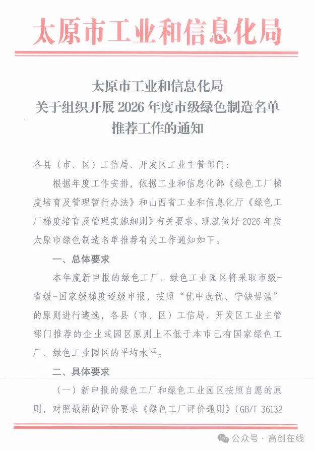 >太原市工业和信息化局关于组织开展2026年度市级绿色制造名单推荐工作的通知