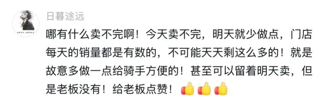 这份暖心,很快在骑手们之间悄悄传开。每晚十点左右,陆续有骑手赶来。多时一晚上五六十份,少时也有二三十份。老板从不挑人,外卖骑手、代驾小哥、出租车司机......不论是不是熟客,一律一元一份。