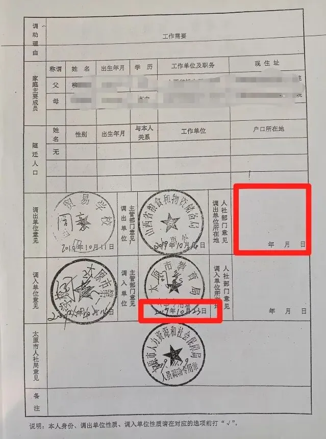 柳先生称,当年的调动手续存在明显违规:审批盖章空白、批准日期比申请日期早15天、专业技术人员10级被错写为科员9级。