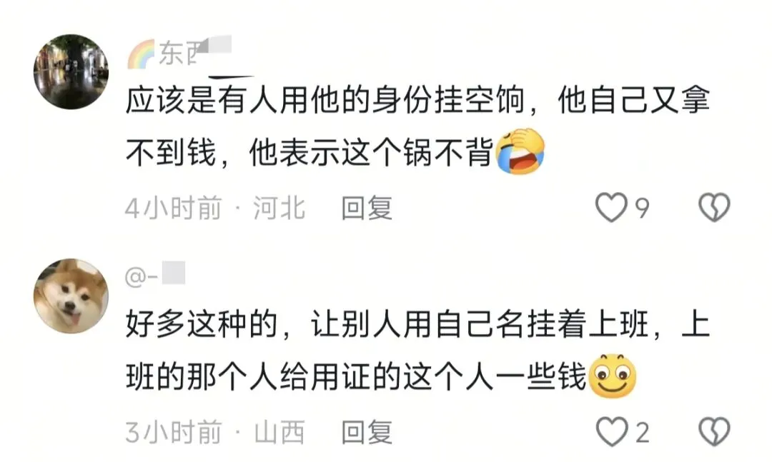 也有网友说:“好多这种的,让别人用自己名挂着上班,上班的那个人给用证的这个人一些钱”。