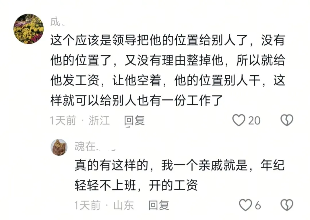 还有网友说:“这个应该是领导把他的位置给别人了,没有他的位置了,又没有理由整掉他,所以就给他发工资,让他空着,他的位置别人干,这样就可以给别人也有一份工作了”。