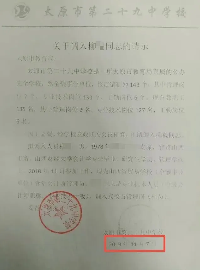 2019年12月,柳先生从山西省贸易学校调入太原二十九中,但并未到岗工作,至今已吃空饷6年。