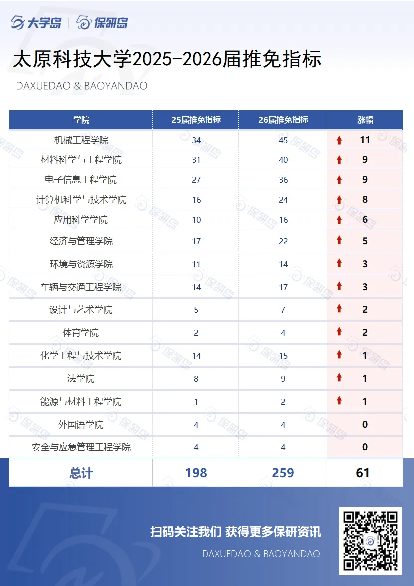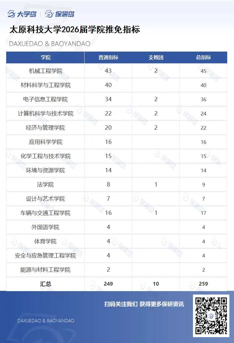 根据其最终公示的推免名单,太原科技大学2026届(对应2022年入学的本科生)推免指标259人,含支教团10人。各学院分配名额如下: