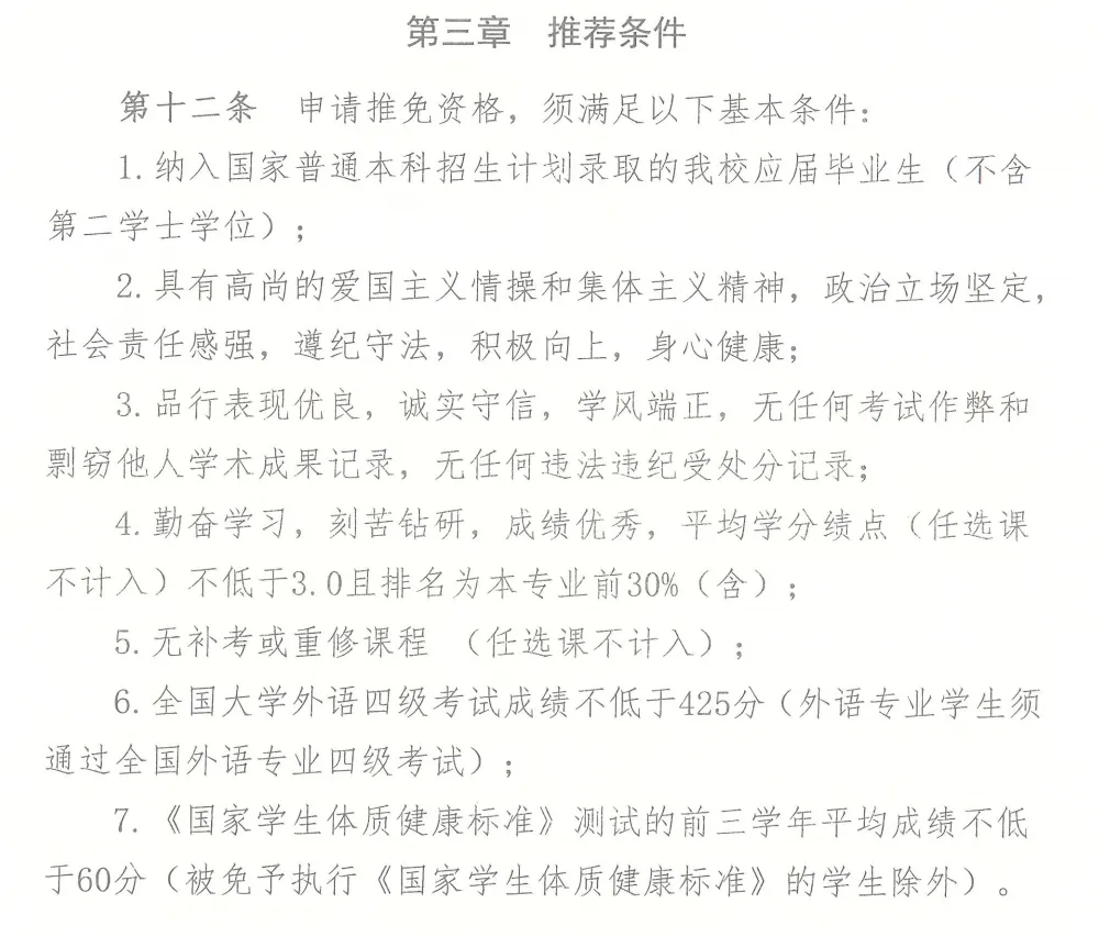 平均学分绩点(任选课不计入)不低于 3.0,且专业排名前 30%(含)。无补考或重修课程(任选课不计入)。
