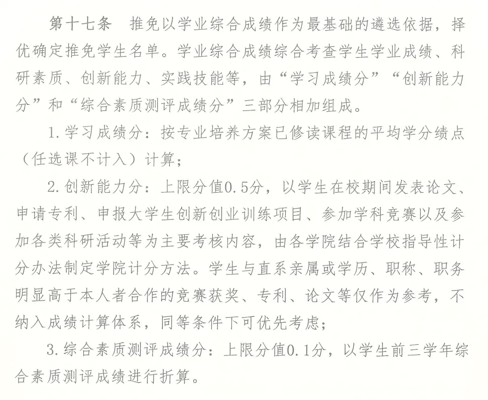 综合成绩 = 学习成绩分 + 创新能力分(上限 0.5 分) + 综合素质测评成绩分(上限 0.1 分)。
