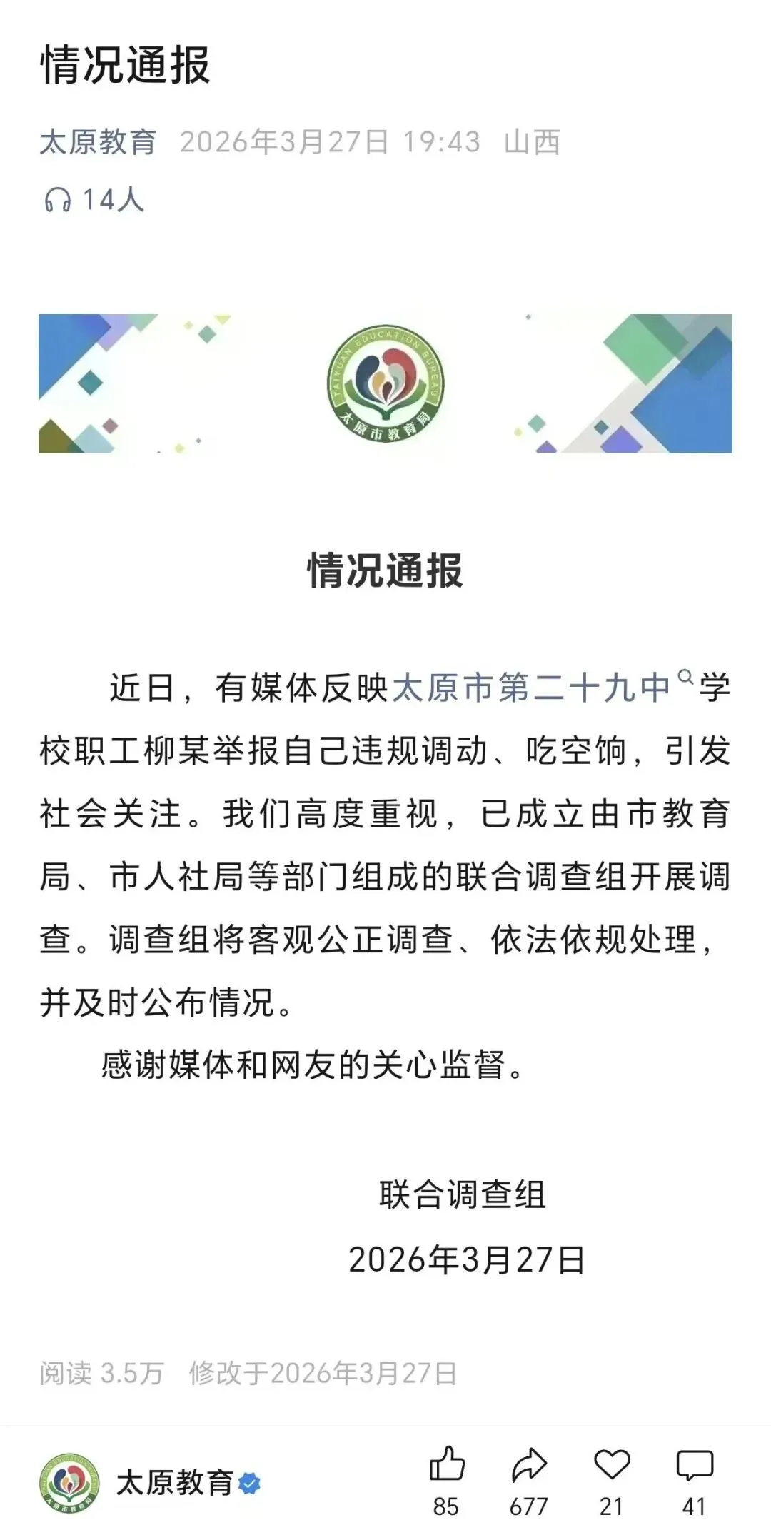 最近,省外媒体纷纷报道:太原市第二十九中学校职工柳某举报自己违规调动、吃空饷一事。近日,山西的柳先生举报自己吃空饷:2019年12月从山西省贸易学校被调入太原市第二十九中学(以下简称“太原二十九中”),但他并没有开始新工作,至今已经吃了6年空饷。