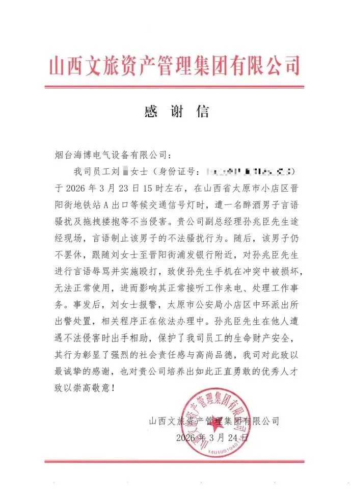 2026年3月23日15时许,孙兆臣途经太原市小店区晋阳街地铁站A出口时,敏锐地发现山西文旅资产管理集团有限公司员工刘璐女士正遭受一名醉酒男子的言语骚扰及强行拖拽。面对这一突发状况,孙兆臣没有丝毫犹豫,当即上前厉声喝止,试图以正义之威震慑施暴者。然而,该男子并未收敛,反而一路尾随二人至附近的浦发银行网点。在冲突升级过程中,该男子不仅对孙兆臣恶语相加,更动手实施殴打,导致孙兆臣手机损坏,通信受阻。尽管面临人身威胁与财产损失,孙兆臣始终坚守正义底线,全力保护当事人安全,直至民警赶到现场将事态平息。事后,山西文旅资产管理集团有限公司专程发来感谢信,对孙兆臣的义举致以崇高敬意,并高度赞扬烟台海博电气设备有限公司培养出了如此正直勇敢的优秀人才。