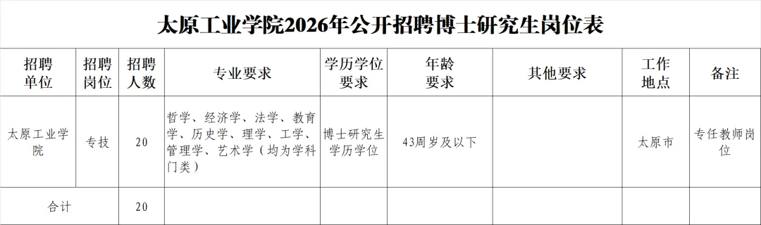 太原工业学院2026年公开招聘博士研究生20名,均为专业技术岗位。招聘岗位所需的具体条件以《太原工业学院2026年公开招聘博士研究生岗位表》(附件1)的要求为准。