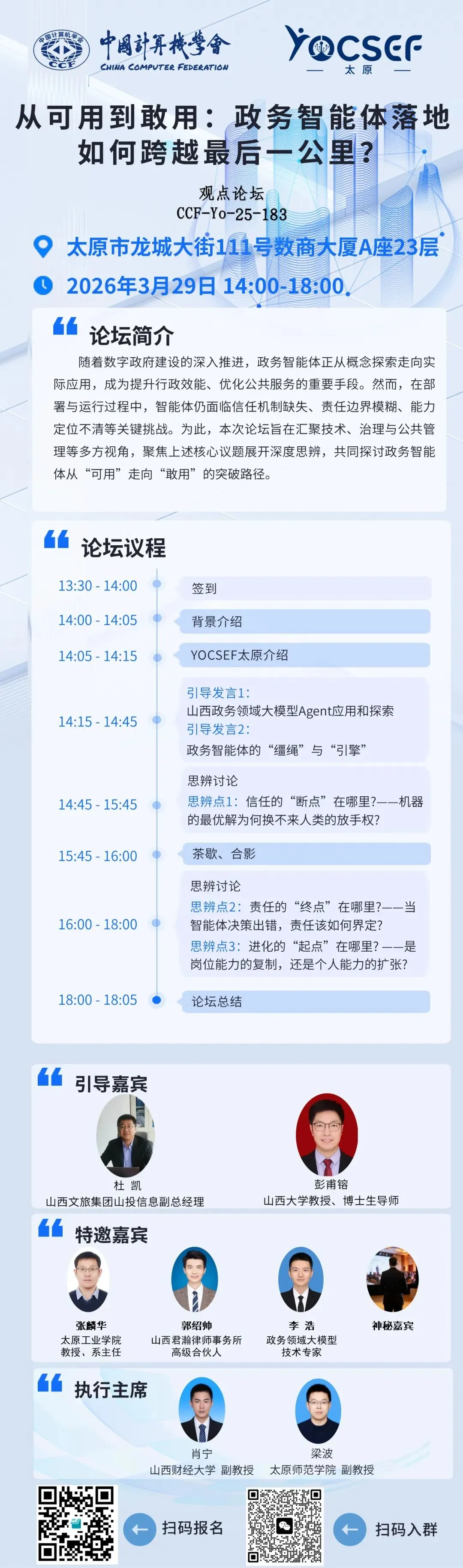 当前位置:首页>太原>会议通知 | YOCSEF太原观点论坛—从“可用”到“敢用”:政务智能体落地如何跨越最后一公里?