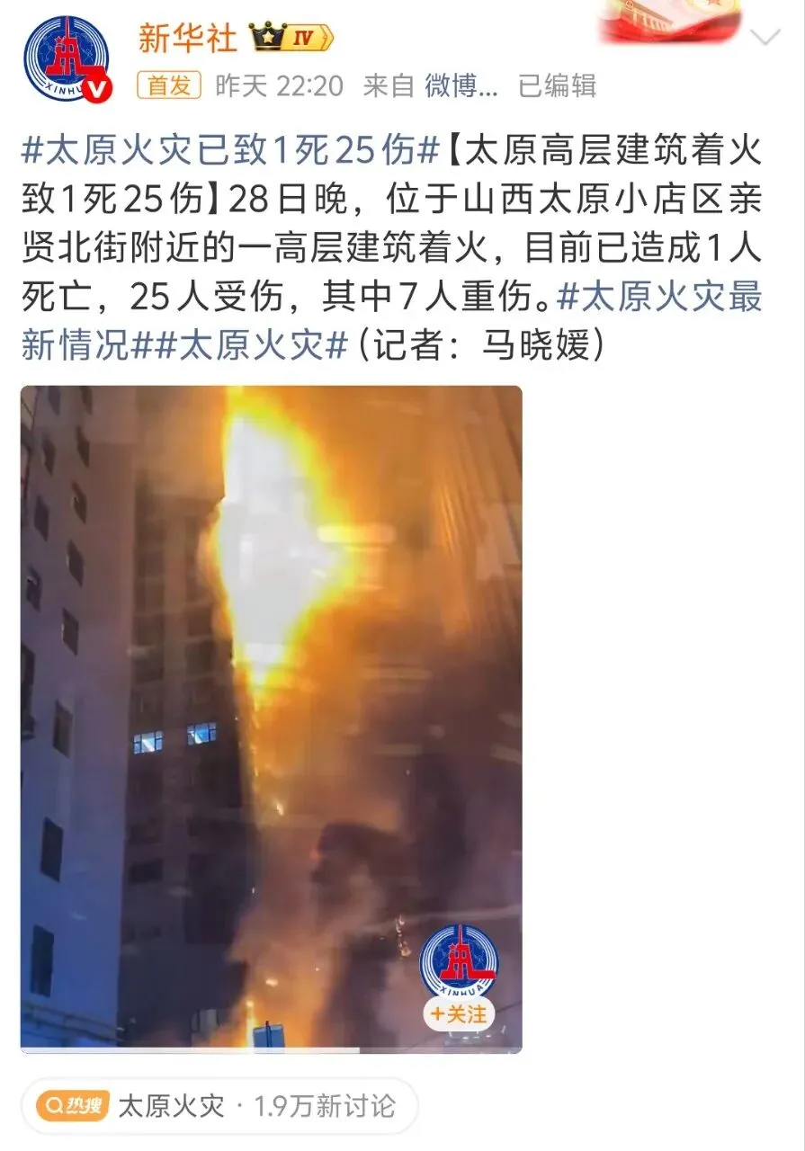 2026年3月28日20时,山西省太原市小店区亲贤北街附近一高层建筑外立面起火,明火已基本扑灭,消防救援人员完成现场搜救与处置