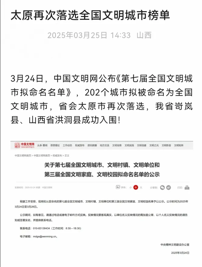 2025年3月24日,第七届全国文明城市拟命名名单的公示,新增全国文明城市202个,其中山西省岢岚县、洪洞县上榜,而太原不在名单之列。