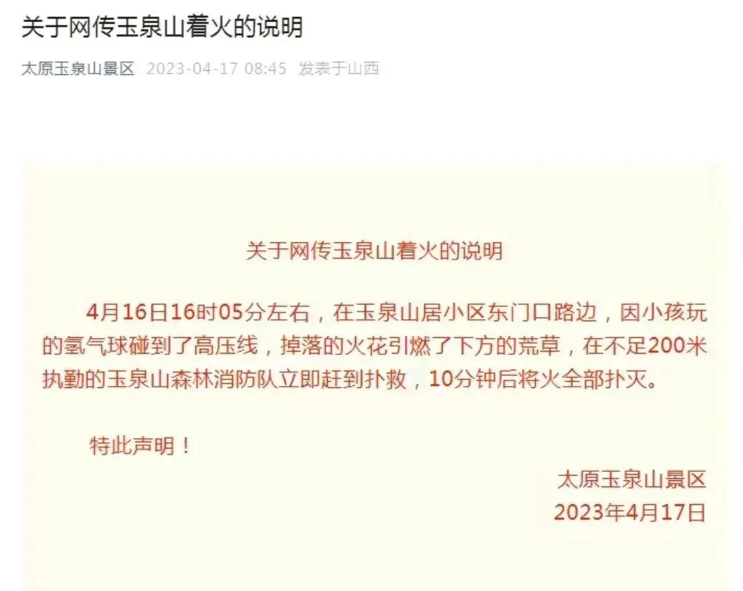 2023年,4月16日,位于山西省太原市万柏林区的玉泉山景区突发火灾。