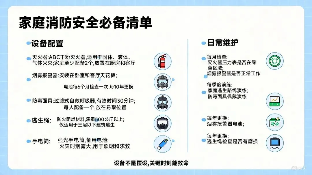 家中配备灭火器、防毒面具等消防器材,掌握正确使用方法