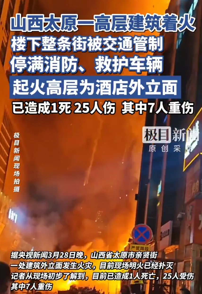 3月28日晚7点52分,山西太原亲贤北街。一栋高层建筑的外立面突然起火,火舌顺着墙壁往上窜,几分钟就吞没了整栋楼。有人从窗户探出头求救,有人尖叫着往外跑。等消防车呼啸赶到,明火虽然半小时就扑灭了,但伤害已经造成——1人死亡,7人重伤,18人轻伤。25个人,25个家庭。有人可能只是下班回家,有人可能正在屋里看电视,有人可能正准备睡觉。谁也没想到,这个普通的夜晚,会变成一场噩梦。今天咱们聊聊这场火——不是因为它烧得有多猛,而是因为它烧出了三个老问题,每一个都跟咱们的安全有关。01 5分钟到场,还是没拦住