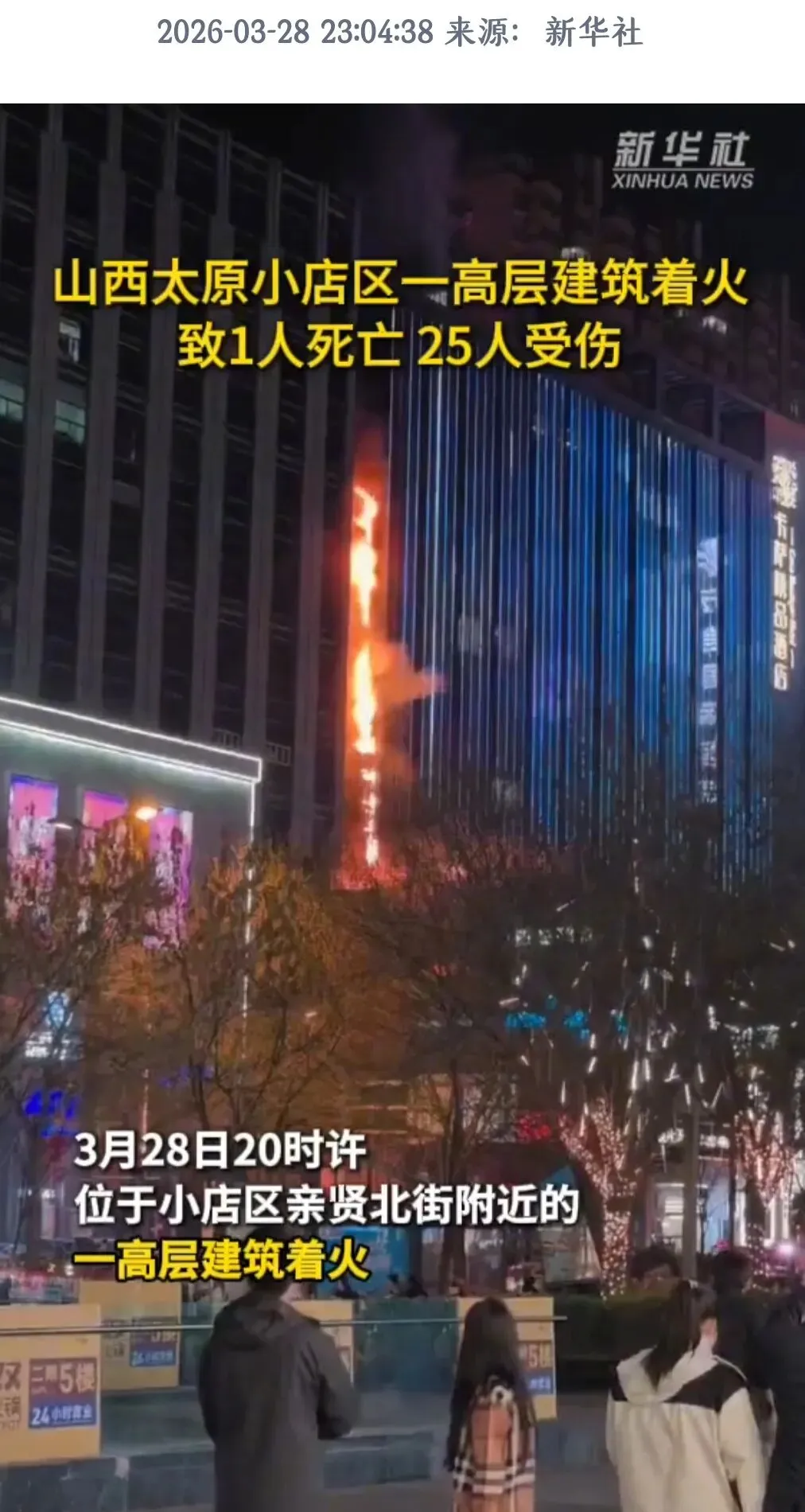 3月28日晚8时许,山西太原市小店区亲贤北街附近,一栋高层建筑突发火灾。截至当晚11时,火灾已造成1人死亡,25人受伤,其中7人重伤。现场目击者称,火势从建筑外立面迅速蔓延,浓烟滚滚,整栋楼被火光映红。救援人员连夜搜救,伤者被紧急送往医院,有人吸入性损伤,有人全身多处烧伤。一位伤者家属在急救室外焦急等待,声音颤抖:“我侄子和侄媳妇都在里面,侄媳妇轻一点,侄子比较严重,到现在还没见到人……”另一位伤者回忆:“我当时正在楼里吃饭,突然就着火了,根本来不及反应。”一、火灾经过:饭店起火引燃外立面