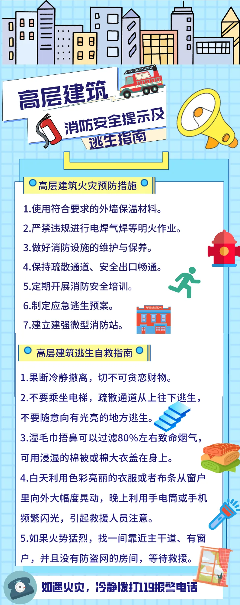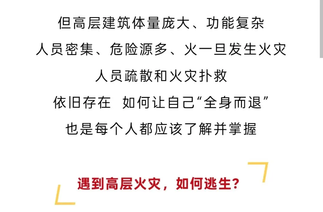 1.发生火灾请立即拨打火警电话“119”,在条件允许的情况下迅速按下火灾报警按钮,并尽可能警示其他住户。 无烟迅速逃生开门前先触摸门锁,若温度不高,楼梯间内无烟气,迅速沿楼梯向下逃生,通过楼梯间时要顺手关闭防火门。向下逃生时,若遇烟气向上蔓延、温度骤升,说明下方疏散通道极可能已被浓烟烈火封堵,应立即向上撤离至远离起火楼层的安全房间,关闭楼梯间防火门,并按照“要诀二”退守待援。若门锁温度较高或开门发现有浓烟,应立即退守待援。用衣物、床单等物品封堵门缝,持续泼水降温、阻隔烟气;同时拨打119,准确报告被困楼层与房间位置,在靠近窗口处通过手电筒、挥舞衣物等方式发出求救信号。要诀三:寻找避难层