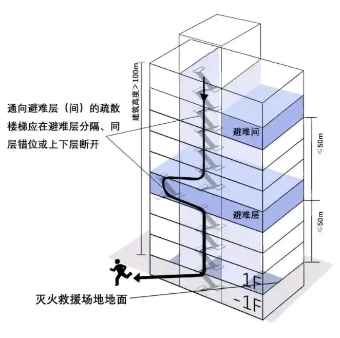 什么是避难层?按照规范要求,建筑高度超过100米的住宅或公共建筑,必须设置避难层。当逃生路线受阻时,人员可就近疏散至避难层避险。 避难层主要用于火灾时人员临时躲避、防止烟气侵入,并等待消防人员救援。依据国内50米云梯消防车的救援标准,首层至第一个避难层的高度不大于50米,便于云梯实施救援。避难层严禁住人及堆放杂物,内部配备消火栓、消防专用电话、防烟送风系统、自动喷水灭火系统、应急广播等完整消防设施。那么逃生的时候