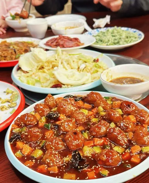 你看太原这一家六口的午餐,一大盘过油肉端上来,配着醋溜白菜、炝拌土豆丝、清炒油菜,再来碗小米粥,就这么吃,没有海参鲍鱼,没有什么精致摆盘,但你就是能感觉到,这一桌菜里有股踏实劲儿,不是那种要证明什么的踏实,是真的知道什么叫吃饱、什么叫舒服、什么叫犯不着折腾的那种踏实。