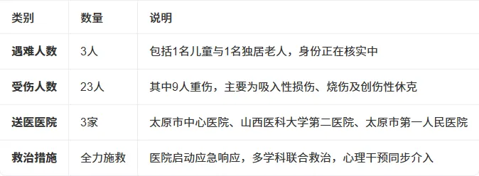 目前,明火已被扑灭,现场搜救与善后处置工作仍在持续进行,起火具体原因正在由消防与应急管理部门联合调查。