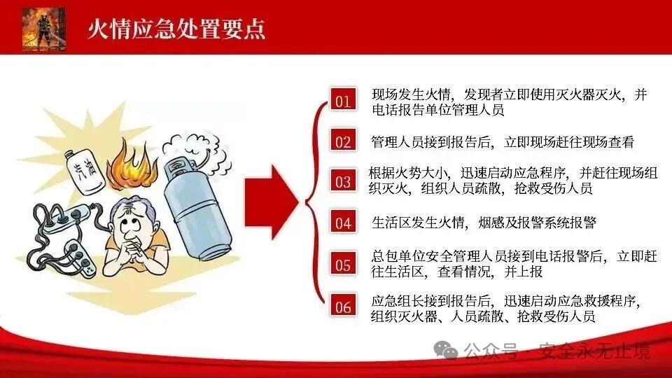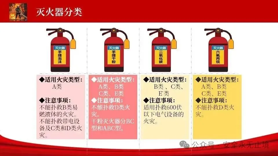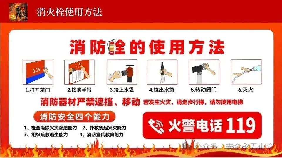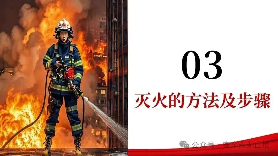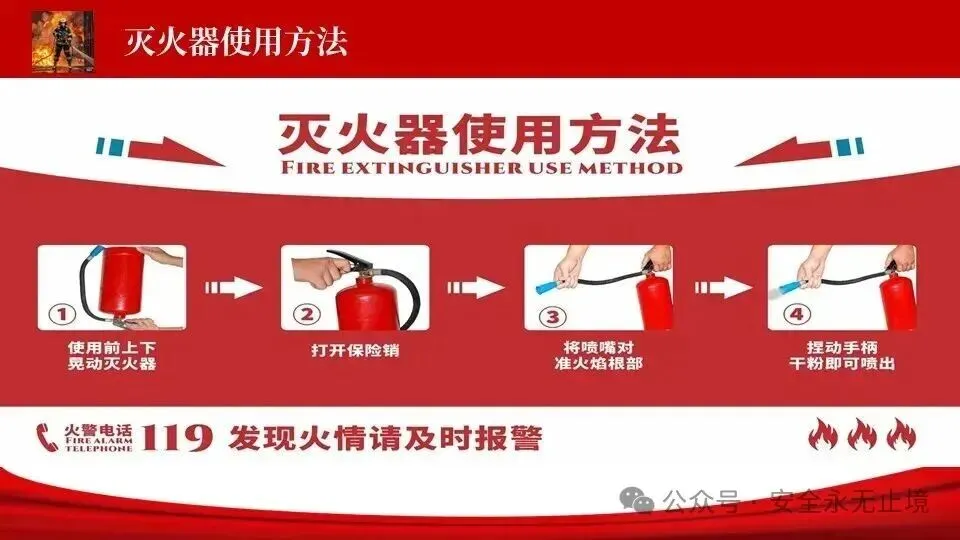 (四)按,左手握喷管,右手按住喷射装置,对准起火点喷射,且水平横向移动,将干粉包围覆盖起火点,直至火势全部扑灭。