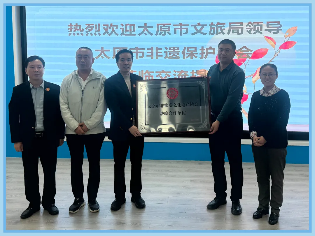 在座谈会上,崔志勇副书记代表文化产业系对太原文旅局各位领导、太原市非物质文化遗产协会会员的到来表示热烈欢迎。贾利涛副主任介绍了文化产业系的办学情况。钱永平副主任介绍了晋中文化生态保护区的现状和发展前景。随后,在太原市和各区(县)文旅局领导、非物质文化遗产保护协会会员、文化产业系教师的共同见证下,太原市非物质文化保护协会佟振宇会长向文化产业系授予“太原市非遗协会战略合作单位”铜牌,崔志勇副书记代表文化产业系接牌。