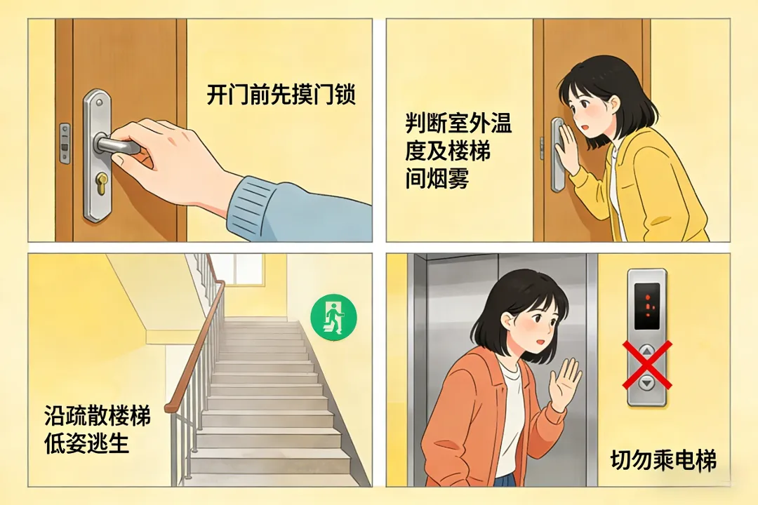 发生火灾时,开门前先摸门锁,若室外温度不高、楼梯间无烟时,立即沿疏散楼梯低姿逃生,切勿乘电梯。