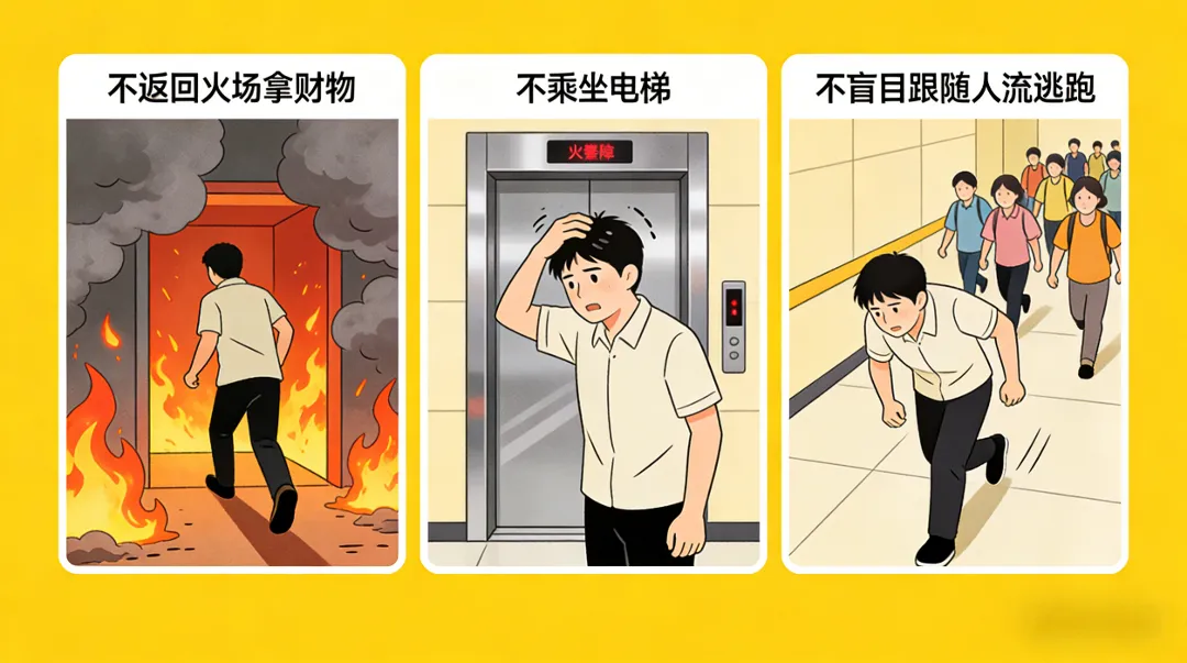 不贪恋财物、不乘坐电梯、不盲目跟随,慌乱扎堆易引发踩踏,错失逃生时机。