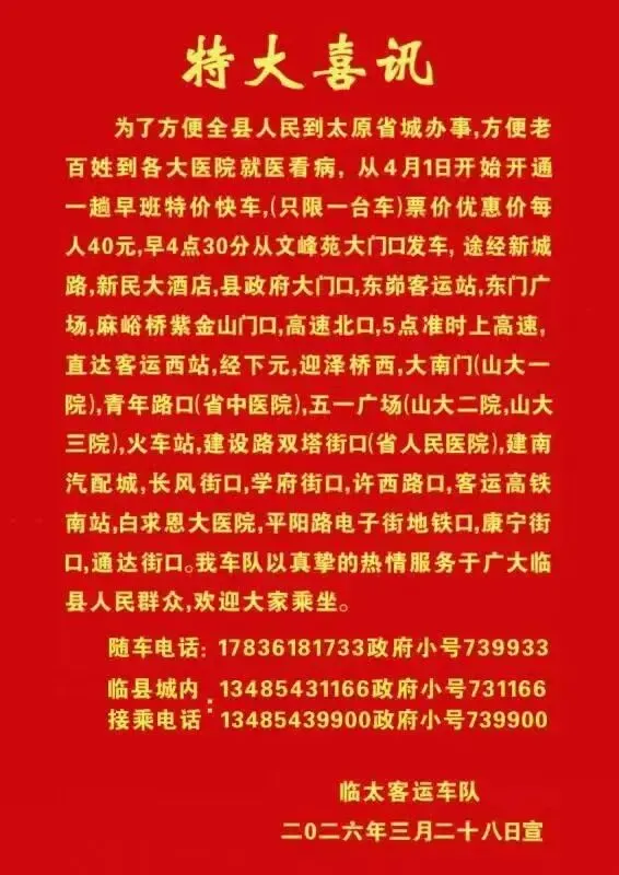 >40 元去太原!临县早班特价车 4 月 1 日发车,途经这些地方…