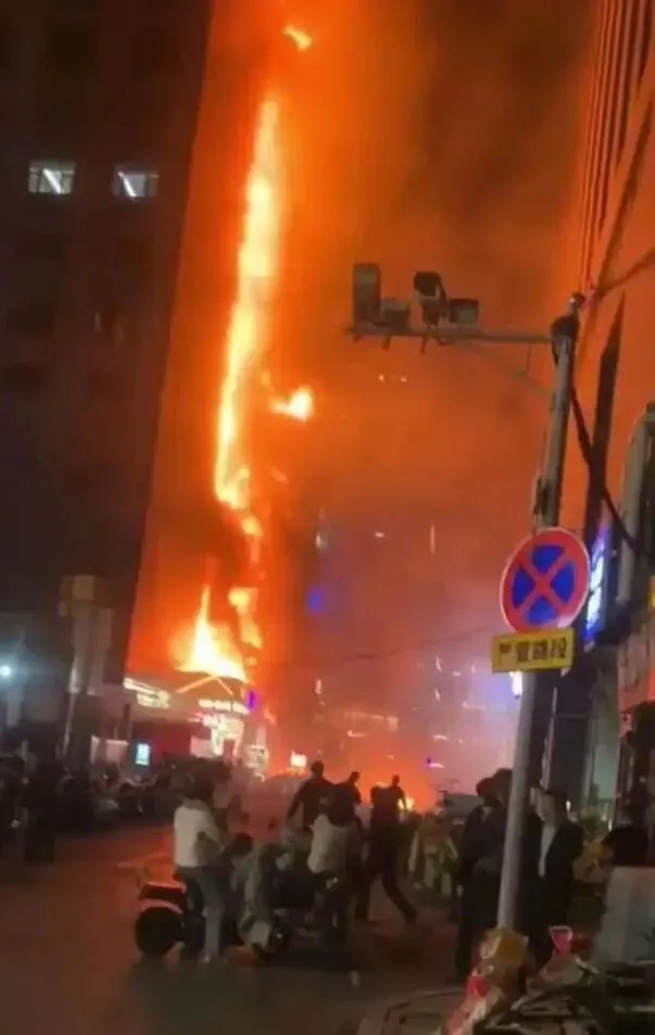 火光冲天、浓烟密布,这座位于核心商圈的楼宇,在夜色中被烈焰吞噬。