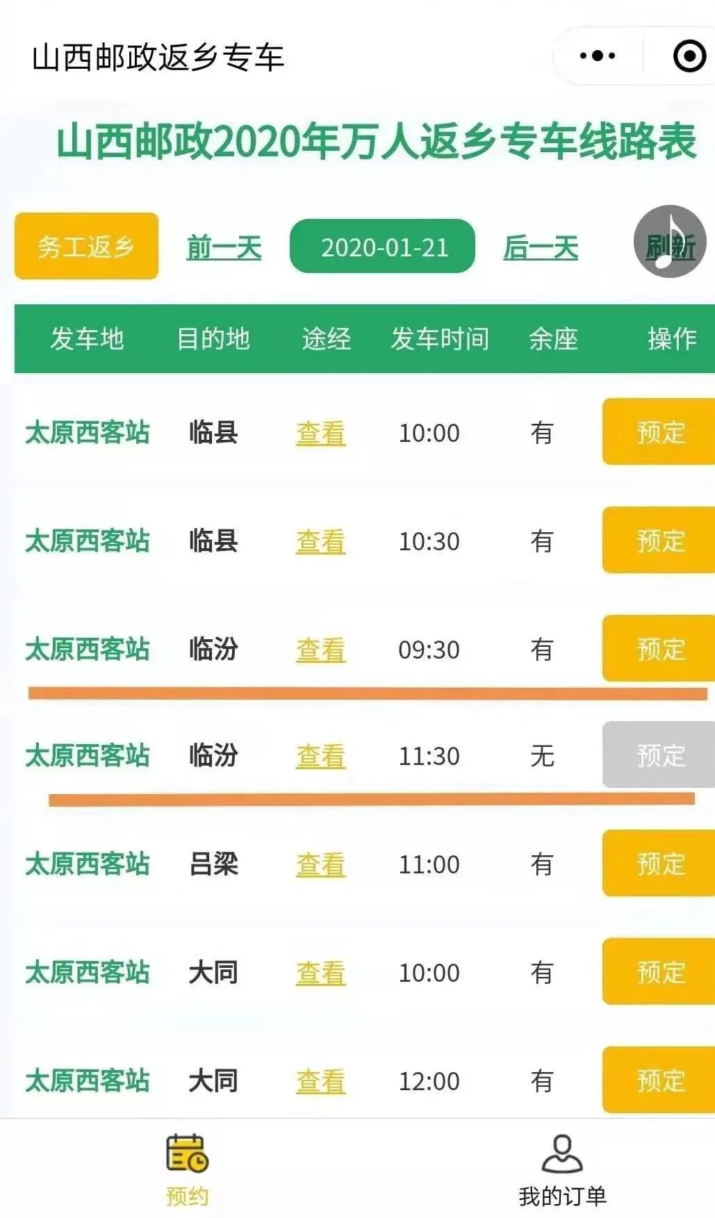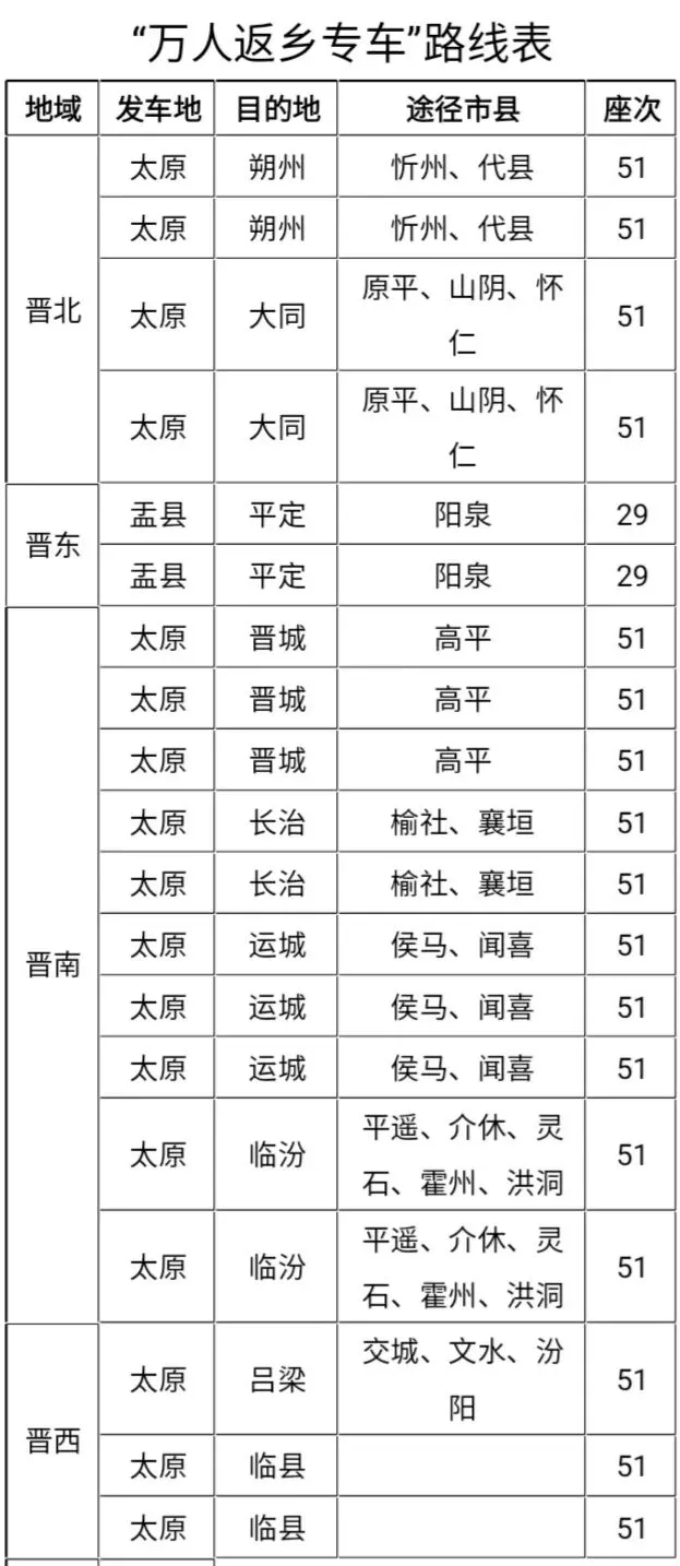 春运期间,山西邮政针对全省外出务工人员及学生开展“万人返乡免费专车”公益活动。外出务工人员及学生凭本人有效证件预约,可免费享受山西邮政春节返乡专车,从太原市区搭乘专车至沿线市县。