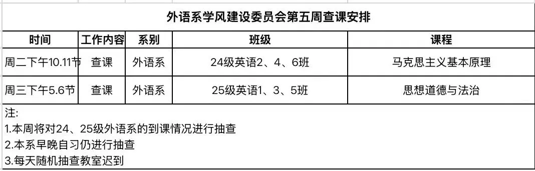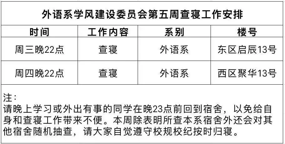外语系学风建设委员会第五周协助老师查课查寝安排如下: