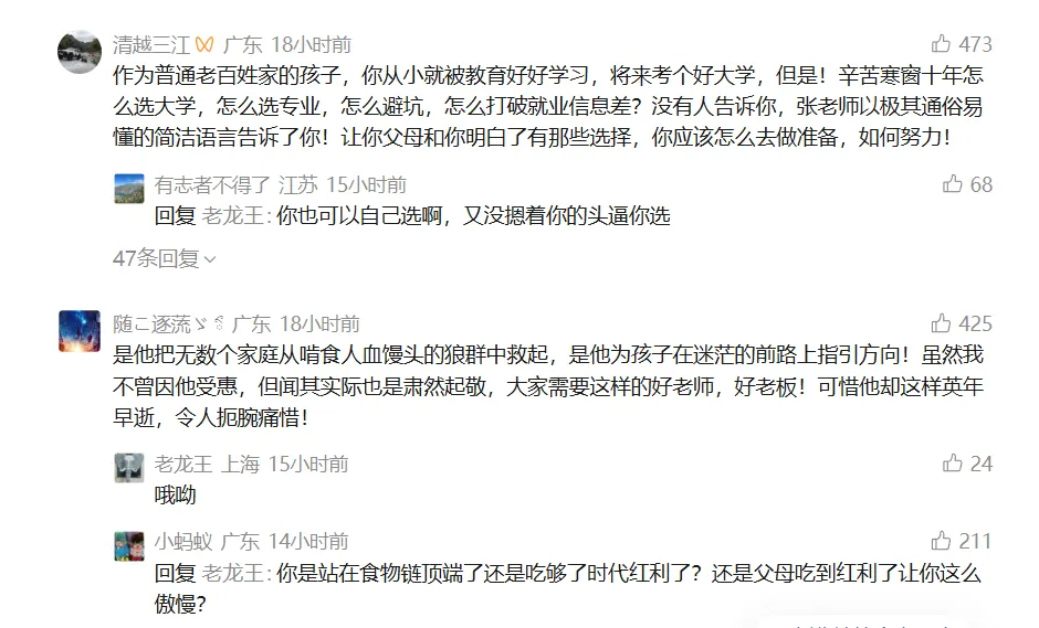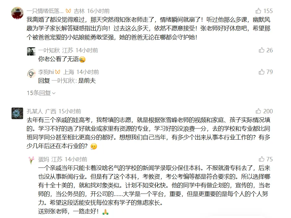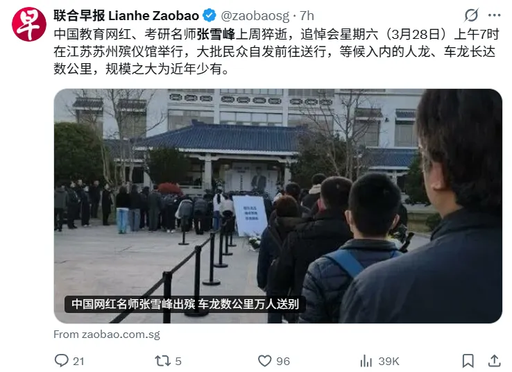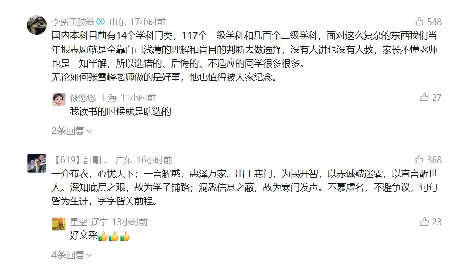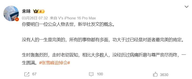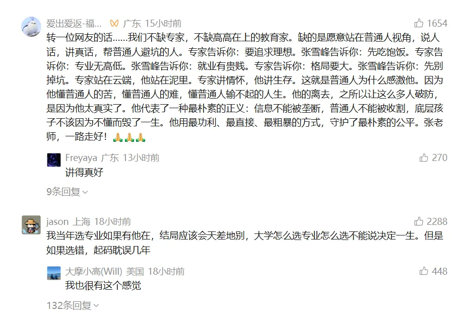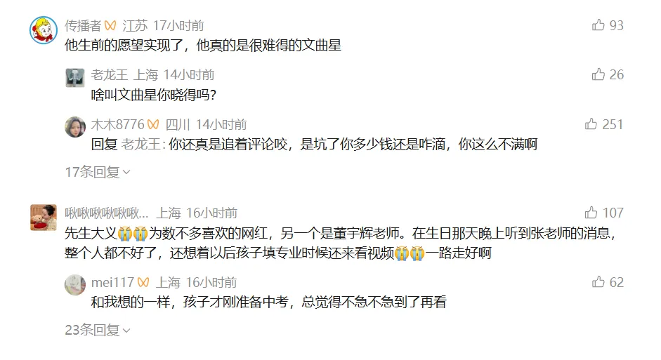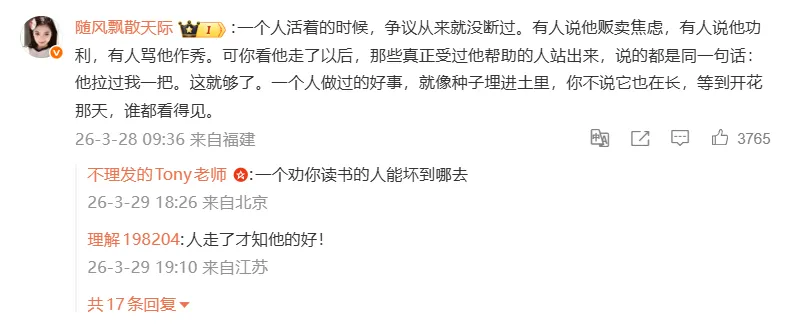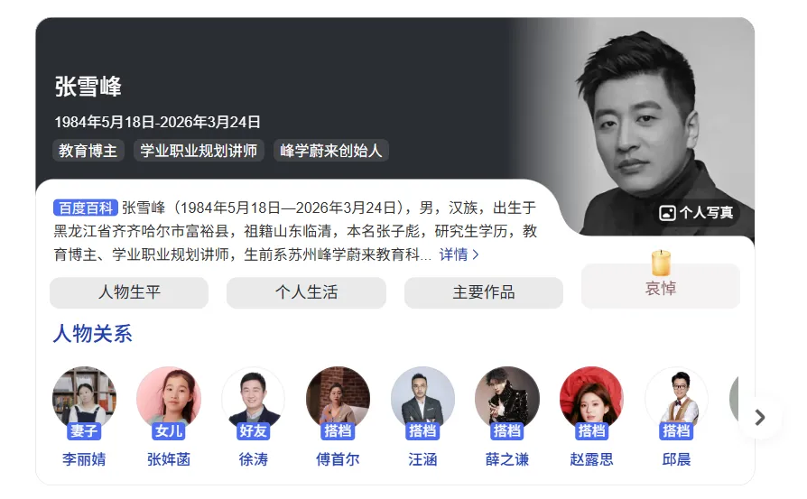 这一回,人民日报、新华社联袂报道,连远在大洋彼岸的《纽约时报》、《联合早报》也放下了偏见,给予了克制而客观的注脚。说实话,这排面,早已扇了那些所谓“顶流网红”一记响亮的耳光。这哪里是简单的告别?这是对张雪峰最顶级、最硬核的“盖棺定论”。放眼望去,国家级官媒集体肃穆,这股声浪,早已冲破了舆论的次元壁。道理其实最糙也最真:因为他真的在替底层孩子找出路,他在玩命给普通人家办实事。就像咱们自家亲戚在饭桌上念叨的那样:“张老师说那个专业好就业,咱听他的。”这份哪怕带着泥土气息的建议,才是最救命的锦囊。老百姓心里都攥着杆秤。谁在作秀,谁在扎根;谁在收割,谁在撑伞,大家看得真真切切。至今还有人傲慢地称他为“网红”。可你见过哪个网红的离去,能让草木含悲、让大地震颤?当一个普通人的告别演变成一场全社会的集体祭奠,你还敢说,他仅仅是一个网红吗?张雪峰为人是真的很好!他的葬礼,除了万人排队祭奠送花,跟他合作过的名人都用自己的方式来怀念他。汪涵和张雪峰因为《火星情报局》相识,后来张雪峰的女儿张姩菡上了汪涵当主持人的少年综艺,两个人同为寒门出身,惺惺相惜。这次葬礼,汪涵提前一天从长沙抵达苏州送老友最后一程。还有赵丽颖的前经纪人凤姐,以及新还珠格格的五阿哥扮演者张睿也托人给张老师送去花圈。其实,张睿和张雪峰交情更浅,同为球迷的二人只是录制过一个旅游节目,已经是18年的事儿了,而且那时候张雪峰还不像现在影响力那么大。还有薛之谦,跟张雪峰老师也是好朋友。薛之谦,在社交平台发文悼念张雪峰。从中也能看出,张雪峰私下是个很好的人,跟他相处愉快,他也有情有义,不管对员工,对学子,还是合作过的人都很好,大家才会纪念他。圈内朋友刚和我聊,说李白这事应该两个人之前是聊过,有沟通过,然后已经闹不开心了,私下有矛盾。但单依纯还是在演唱会唱了(不知道怎么想的),所以李荣浩直接发火了。他们圈内大部分还是站李荣浩,因为他们说李荣浩这人在圈内口碑不差,他会发脾气应该是忍无可忍了那种。因为单依纯现在背后的团队也非常成熟了,会积极去公关和处理,而且单依纯实力也的确在那里,商业资源不会受到什么影响。业内现在其实也就是吃瓜,后续品牌这些该合作还是合作,大概率赔钱,其他影响不大。大家应该都听过《李白》这首歌。这几天,这首歌又因为一场争议被推上了风口浪尖。事件大致情况是:歌手单依纯在3月29日“纯妹妹2.0”巡演深圳站演唱会接近尾声时,在感谢到场歌迷及合作方的过程中一度哽咽落泪。此前,歌手李荣浩发文表示,自己曾拒绝单依纯方面的版权邀约,但对方仍在3月28日深圳演唱会上演唱其作品《李白》。李荣浩认为,这一行为属于未经授权的演唱,已向中国音乐著作权协会反映相关情况。29日下午,单依纯在个人微博回应称:将与团队尽快核实情况,并向李荣浩及相关方致以诚恳的歉意。第一次听《李白》,是在一家饭店。如今已经记不清那位驻唱女歌手的嗓音细节,只记得当时被旋律深深吸引,甚至放下筷子,专心把整首歌听完。想起吕方曾在第七届《最爱金曲榜》音乐盛典上被问到:一首歌的成功,作词、作曲、编曲和演唱者,哪个更重要?他回答说,作曲和编曲最重要,填词也重要,而演唱者排在最后。虽然有自谦的成分,但逻辑其实很清楚——一个歌手想要打动别人,首先要被旋律本身打动。他指出,旋律是否动听,直接决定了一首歌的生命力,因此很多粤语流行曲创作者采取“先曲后词”的方式,先完成旋律,再填词,从而更容易实现词曲兼优。所以,也能理解创作者对作品被侵权的敏感与坚持。《李白》这首歌承载着创作者的表达与心血,原创者理应获得应有的尊重。这类版权问题,确实值得持续关注。3月28日,河南项城市人民公园门口发生一起刑事案件。事发前,两名骑电动车的人员发生碰撞,随后引发激烈争吵。令人痛心的是,双方均为未成年人。目前,当地警方已证实事件发生,具体情况仍以官方通报为准。虽然细节尚未完全披露,但类似事件背后的问题,其实并不陌生——青少年情绪管理能力不足、冲突处理方式单一,加之部分家庭教育缺位,容易在极端情境下演变为悲剧。近些年,这类事件并非个案。比如“3·10邯郸初中生案件”:几名未成年人因矛盾预谋伤害同学并实施犯罪,案件曾引发广泛关注。后续法院依法作出判决,对主要责任人追究刑事责任,同时对未直接参与加害行为的人员实施专门矫治教育。围绕“未成年人是否可以被宽恕”的讨论,也一直存在。有人强调改过自新的可能性,也有人更关注对受害者及社会的交代。现实往往比观点更复杂:既需要法律的刚性约束,也离不开教育与引导的长期作用。从更大的层面看,教材、家庭氛围与社会价值导向,同样在潜移默化地塑造一代人的认知。我自己有个很深的印象:小时候读过一篇课文,写一个家庭遭遇经济困难,父亲带着孩子去偏远水边养殖谋生。父亲辛苦劳作,却几乎不与孩子交流,但文章的主题是赞美他的勤恳与沉默付出。长大后再回看,会发现这其实也是一种时代叙事——过去的评价体系里,“埋头苦干”本身就足够被肯定,而情感沟通、责任分担、成长引导这些维度,往往被忽视。这种观念的延续,也在影响我们这一代人。小时候被反复强调的标准过于单一