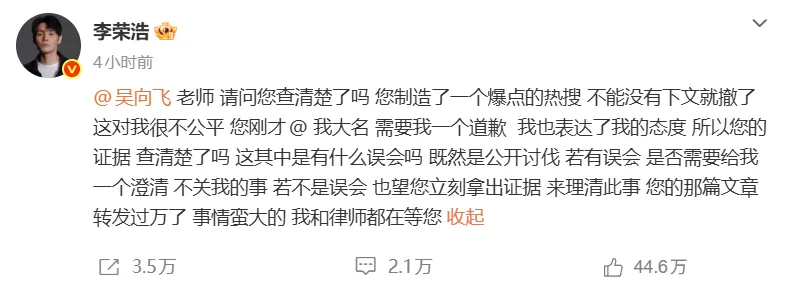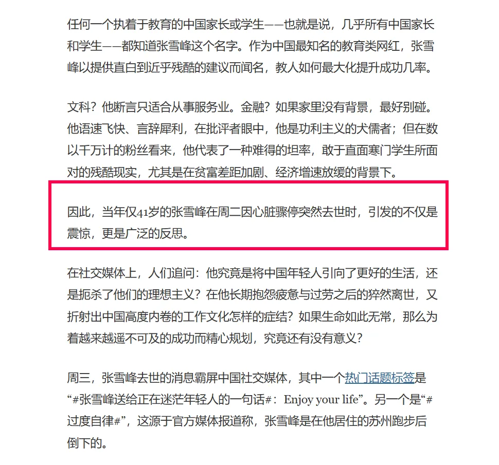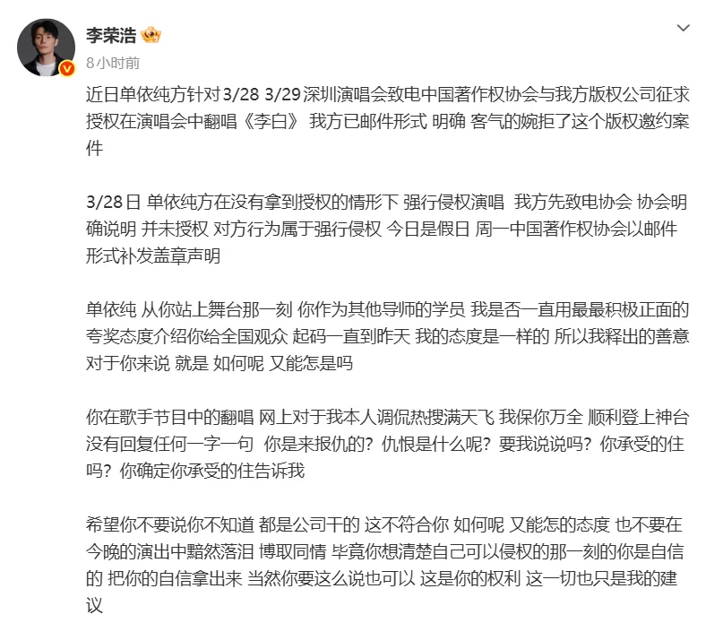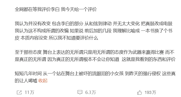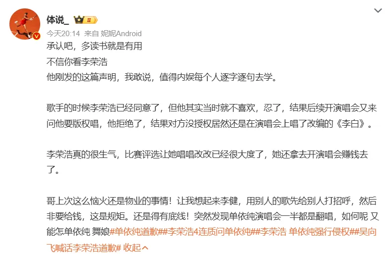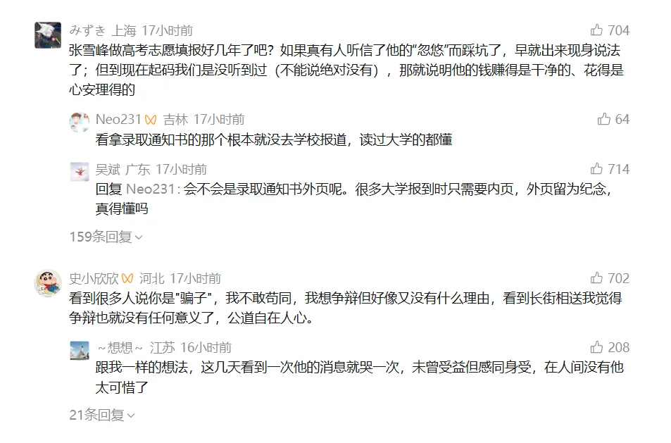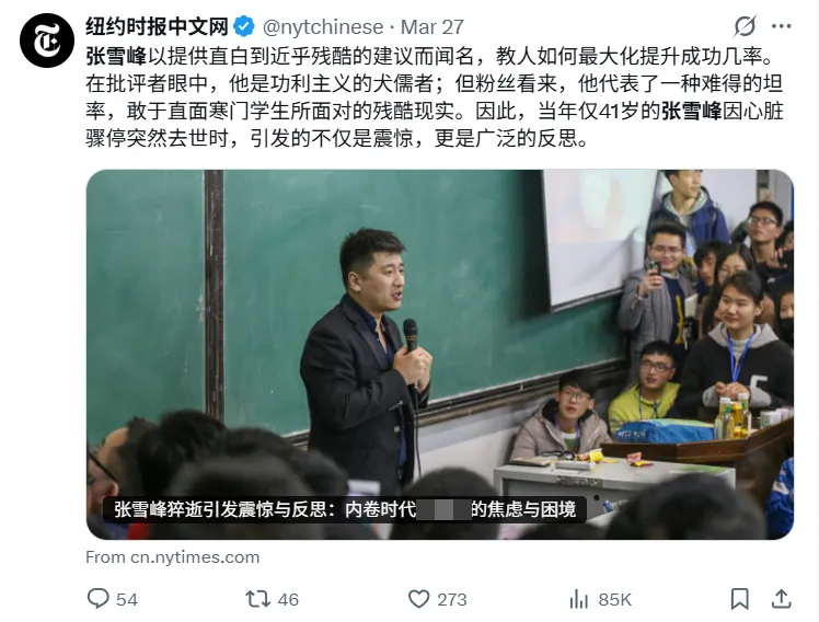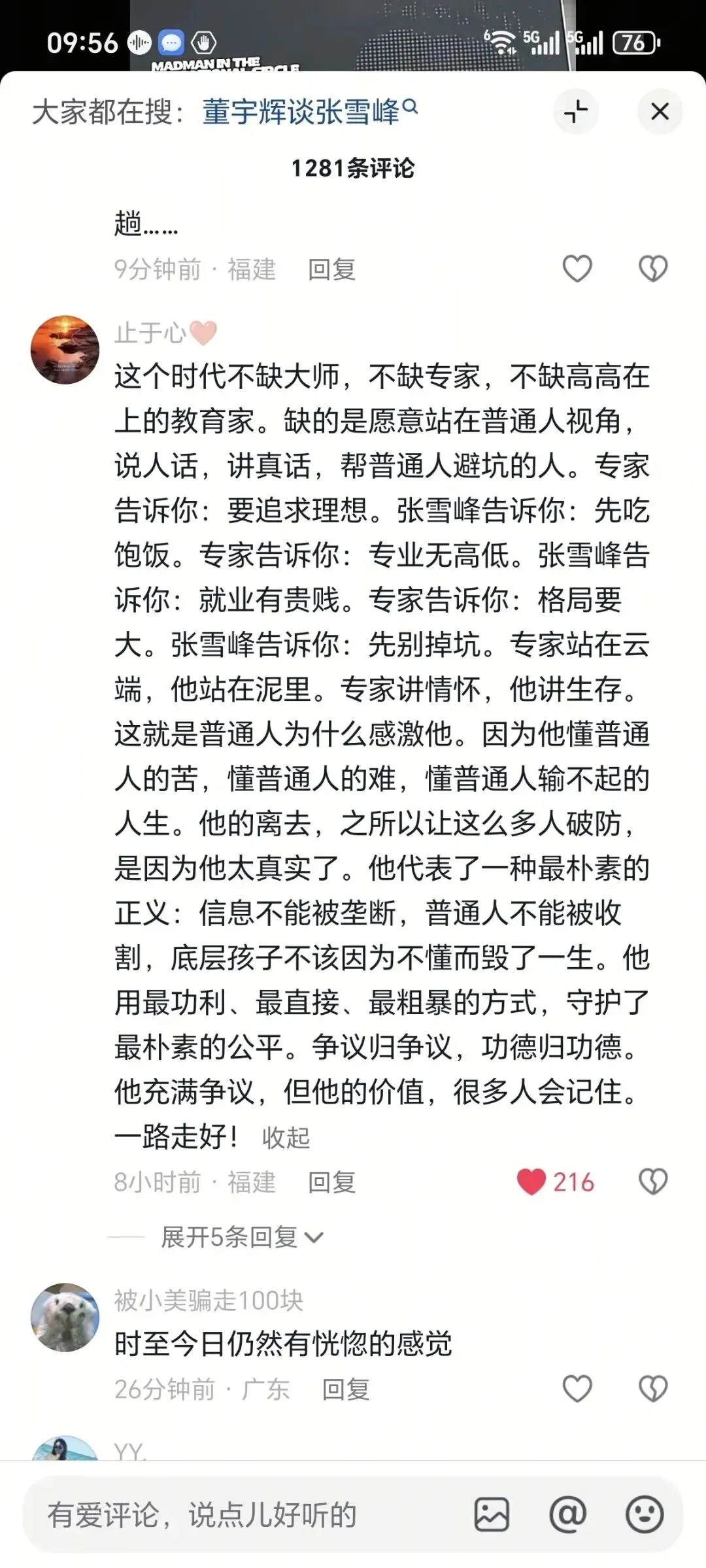 这一回,人民日报、新华社联袂报道,连远在大洋彼岸的《纽约时报》、《联合早报》也放下了偏见,给予了克制而客观的注脚。说实话,这排面,早已扇了那些所谓“顶流网红”一记响亮的耳光。这哪里是简单的告别?这是对张雪峰最顶级、最硬核的“盖棺定论”。放眼望去,国家级官媒集体肃穆,这股声浪,早已冲破了舆论的次元壁。道理其实最糙也最真:因为他真的在替底层孩子找出路,他在玩命给普通人家办实事。就像咱们自家亲戚在饭桌上念叨的那样:“张老师说那个专业好就业,咱听他的。”这份哪怕带着泥土气息的建议,才是最救命的锦囊。老百姓心里都攥着杆秤。谁在作秀,谁在扎根;谁在收割,谁在撑伞,大家看得真真切切。至今还有人傲慢地称他为“网红”。可你见过哪个网红的离去,能让草木含悲、让大地震颤?当一个普通人的告别演变成一场全社会的集体祭奠,你还敢说,他仅仅是一个网红吗?张雪峰为人是真的很好!他的葬礼,除了万人排队祭奠送花,跟他合作过的名人都用自己的方式来怀念他。汪涵和张雪峰因为《火星情报局》相识,后来张雪峰的女儿张姩菡上了汪涵当主持人的少年综艺,两个人同为寒门出身,惺惺相惜。这次葬礼,汪涵提前一天从长沙抵达苏州送老友最后一程。还有赵丽颖的前经纪人凤姐,以及新还珠格格的五阿哥扮演者张睿也托人给张老师送去花圈。其实,张睿和张雪峰交情更浅,同为球迷的二人只是录制过一个旅游节目,已经是18年的事儿了,而且那时候张雪峰还不像现在影响力那么大。还有薛之谦,跟张雪峰老师也是好朋友。薛之谦,在社交平台发文悼念张雪峰。从中也能看出,张雪峰私下是个很好的人,跟他相处愉快,他也有情有义,不管对员工,对学子,还是合作过的人都很好,大家才会纪念他。圈内朋友刚和我聊,说李白这事应该两个人之前是聊过,有沟通过,然后已经闹不开心了,私下有矛盾。但单依纯还是在演唱会唱了(不知道怎么想的),所以李荣浩直接发火了。他们圈内大部分还是站李荣浩,因为他们说李荣浩这人在圈内口碑不差,他会发脾气应该是忍无可忍了那种。因为单依纯现在背后的团队也非常成熟了,会积极去公关和处理,而且单依纯实力也的确在那里,商业资源不会受到什么影响。业内现在其实也就是吃瓜,后续品牌这些该合作还是合作,大概率赔钱,其他影响不大。大家应该都听过《李白》这首歌。这几天,这首歌又因为一场争议被推上了风口浪尖。事件大致情况是:歌手单依纯在3月29日“纯妹妹2.0”巡演深圳站演唱会接近尾声时,在感谢到场歌迷及合作方的过程中一度哽咽落泪。此前,歌手李荣浩发文表示,自己曾拒绝单依纯方面的版权邀约,但对方仍在3月28日深圳演唱会上演唱其作品《李白》。李荣浩认为,这一行为属于未经授权的演唱,已向中国音乐著作权协会反映相关情况。29日下午,单依纯在个人微博回应称:将与团队尽快核实情况,并向李荣浩及相关方致以诚恳的歉意。第一次听《李白》,是在一家饭店。如今已经记不清那位驻唱女歌手的嗓音细节,只记得当时被旋律深深吸引,甚至放下筷子,专心把整首歌听完。想起吕方曾在第七届《最爱金曲榜》音乐盛典上被问到:一首歌的成功,作词、作曲、编曲和演唱者,哪个更重要?他回答说,作曲和编曲最重要,填词也重要,而演唱者排在最后。虽然有自谦的成分,但逻辑其实很清楚——一个歌手想要打动别人,首先要被旋律本身打动。他指出,旋律是否动听,直接决定了一首歌的生命力,因此很多粤语流行曲创作者采取“先曲后词”的方式,先完成旋律,再填词,从而更容易实现词曲兼优。所以,也能理解创作者对作品被侵权的敏感与坚持。《李白》这首歌承载着创作者的表达与心血,原创者理应获得应有的尊重。这类版权问题,确实值得持续关注。3月28日,河南项城市人民公园门口发生一起刑事案件。事发前,两名骑电动车的人员发生碰撞,随后引发激烈争吵。令人痛心的是,双方均为未成年人。目前,当地警方已证实事件发生,具体情况仍以官方通报为准。虽然细节尚未完全披露,但类似事件背后的问题,其实并不陌生——青少年情绪管理能力不足、冲突处理方式单一,加之部分家庭教育缺位,容易在极端情境下演变为悲剧。近些年,这类事件并非个案。比如“3·10邯郸初中生案件”:几名未成年人因矛盾预谋伤害同学并实施犯罪,案件曾引发广泛关注。后续法院依法作出判决,对主要责任人追究刑事责任,同时对未直接参与加害行为的人员实施专门矫治教育。围绕“未成年人是否可以被宽恕”的讨论,也一直存在。有人强调改过自新的可能性,也有人更关注对受害者及社会的交代。现实往往比观点更复杂:既需要法律的刚性约束,也离不开教育与引导的长期作用。从更大的层面看,教材、家庭氛围与社会价值导向,同样在潜移默化地塑造一代人的认知。我自己有个很深的印象:小时候读过一篇课文,写一个家庭遭遇经济困难,父亲带着孩子去偏远水边养殖谋生。父亲辛苦劳作,却几乎不与孩子交流,但文章的主题是赞美他的勤恳与沉默付出。长大后再回看,会发现这其实也是一种时代叙事——过去的评价体系里,“埋头苦干”本身就足够被肯定,而情感沟通、责任分担、成长引导这些维度,往往被忽视。这种观念的延续,也在影响我们这一代人。小时候被反复强调的标准过于单一