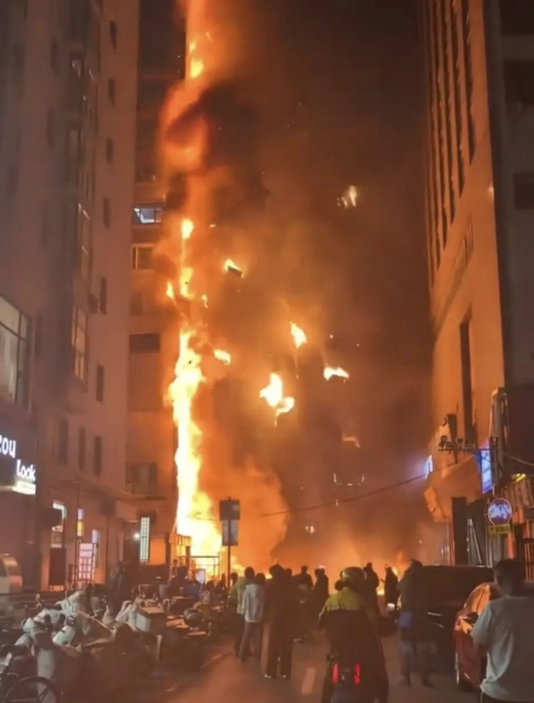 夜间风力叠加高层建筑“烟囱效应”,火势沿外墙快速垂直攀升,形成立体燃烧,楼内大量人员被困,救援与逃生难度陡增。