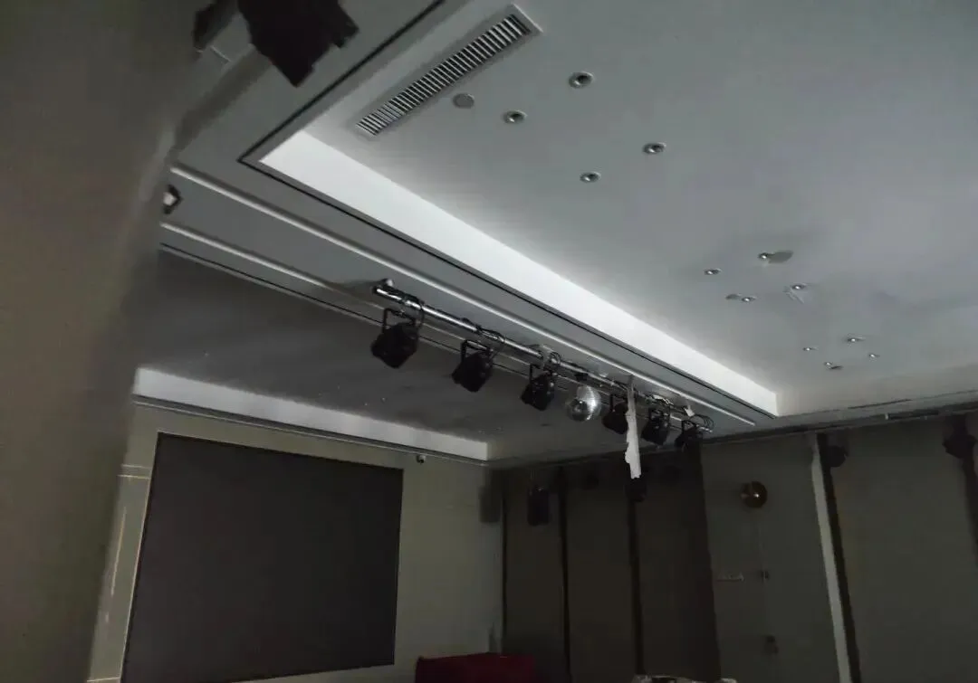▲起火大楼内一家饭店的包房,火灾后天花板渗水,地面全部湿透
