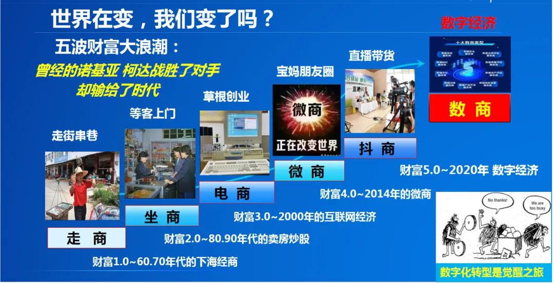 2:数字化转型:传统商业模式已经不再适合当前的经济发展,商家,企业赚取差价的方式即将退出历史舞台,以前货是你的你赚钱,店是你的你赚钱,数字化时代是人是你的你才赚钱。