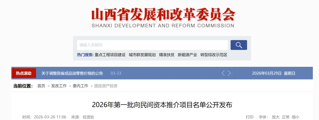 3月26日,山西省发改委发布了2026年第一批向民间资本推介项目名单。