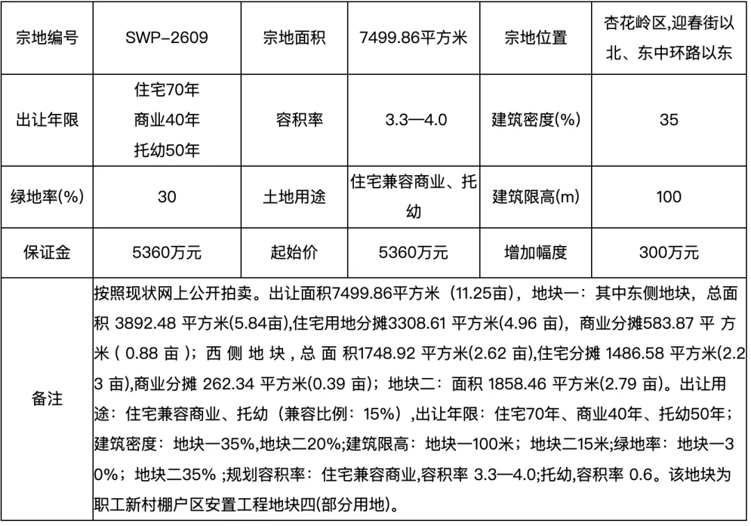 宗地位于杏花岭区,迎春街以北、东中环路以东。容积率住宅兼容商业3.3-4.0,托幼0.6。建筑密度地块一35%,地块二20%。绿地率地块一30%,地块二35%。建筑限高地块一100m,地块二15m。