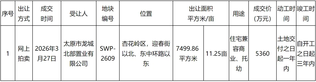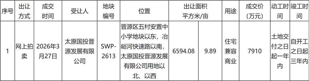 太原国投晋源发展有限公司以底价拍得该地块。