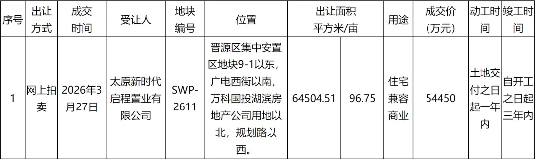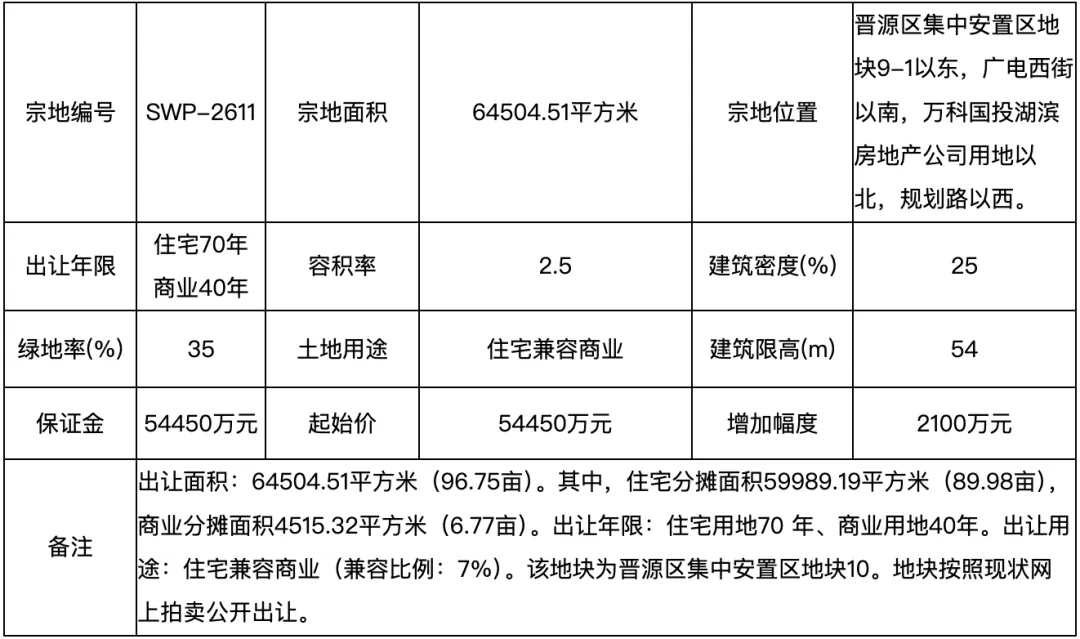 地块起始价54450万元。该地块为晋源区集中安置区地块10。地块按现状网上拍卖公开出让。