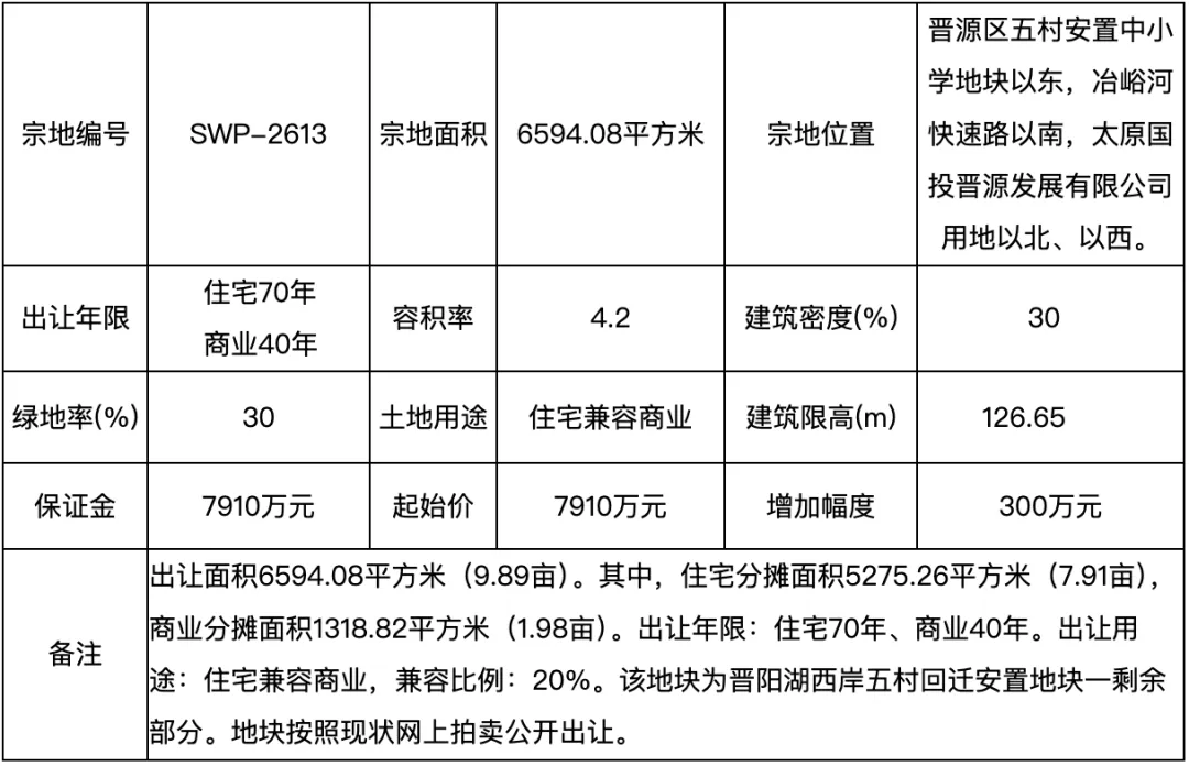 地块起始价7910万元。该地块为晋阳湖西岸五村回迁安置地块一剩余部分。地块按现状网上拍卖公开出让。