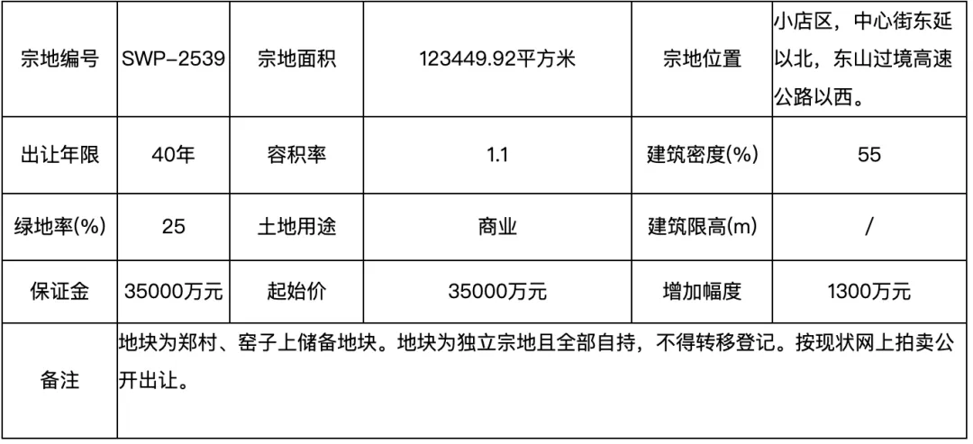 地块起始价35000万元。该地块为郑村、窑子上储备地块。地块为独立宗地且全部自持,不得转移登记。地块按现状网上拍卖公开出让。