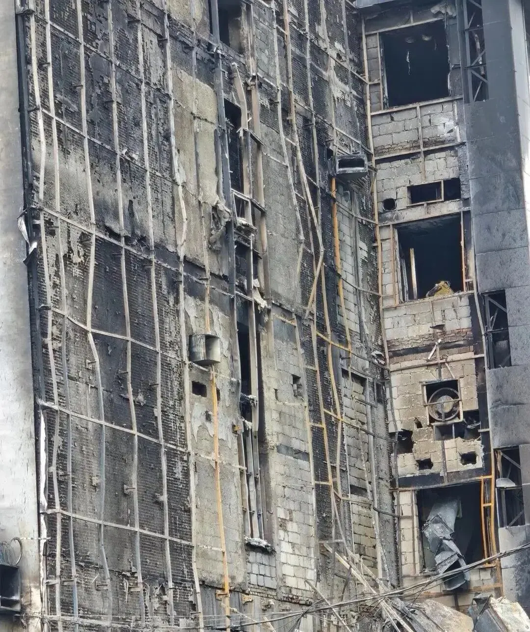 大火被扑灭后,建筑外立面装饰被烧得只剩骨架,二三层窗户玻璃全部破碎,外墙保温层几乎完全脱落。更令人后怕的是,29日23时,一楼广告牌顶处再次闪烁火光,现场保安和群众紧急报警,消防车迅速赶到才避免更大灾难。