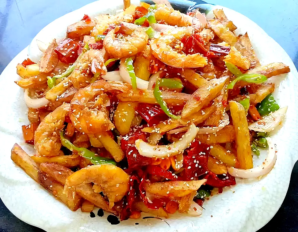 薯条基围虾、小酥肉海带炖豆腐、蘑菇烧油菜、蒸饺子、大米、蒸南瓜、黑米粥