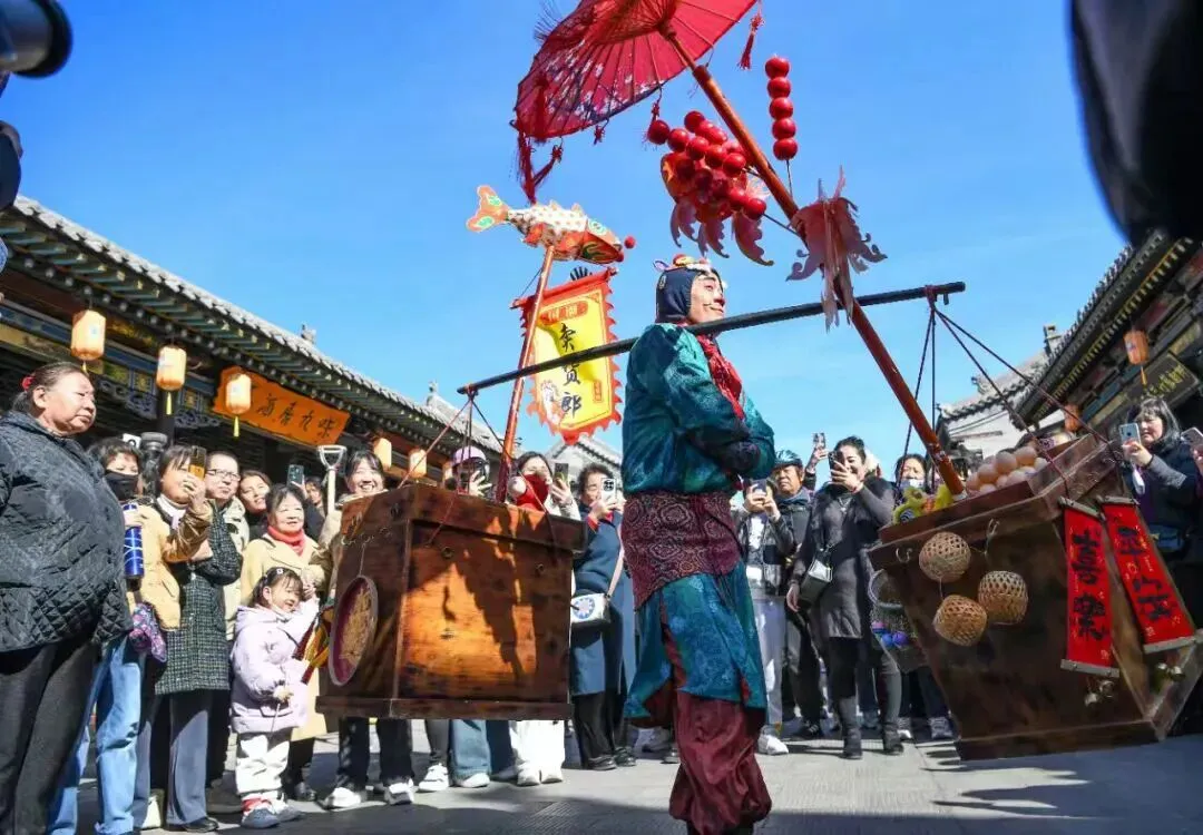 老街的阳光里,挑着货郎担的身影一摇一晃,红伞映着蓝天,彩鱼串着糖球,满街都是热闹的年味。他眉眼弯弯,扮相俏皮,一颦一笑间,把老行当的烟火气,揉进了春日的市井喧嚣里。