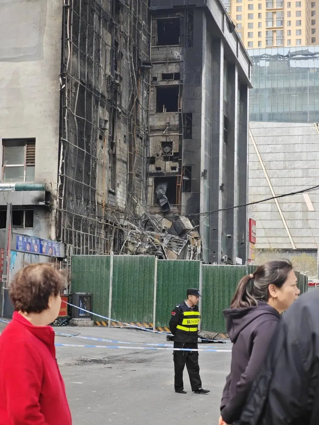 3月29日下午,封面新闻记者在现场看到,事故现场已建起绿色围挡,楼体东侧外立面烧毁脱落,墙面漆黑。有消防员在事故建筑内进行工作,警戒线封锁了怡和巷出入口,起火一侧酒店及其他商家已停业。