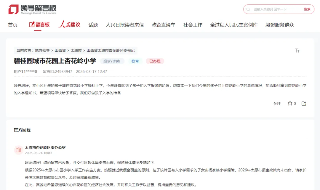 网友您好!您的留言已收悉,并交付区教体局负责办理,现将具体情况反馈如下: 根据2025年太原市市区小学入学工作实施方案,按照就近就便全覆盖的原则,位于该片区有入小学需求的子女由杨家峪小学保障。2026年太原市招生政策尚未出台,请家长关注太原教育微信公众号,及时获取最新政策。 在此,真诚地希望您继续关心杏花岭区的经济社会发展,并对相关工作予以监督,提出宝贵的意见和建议。