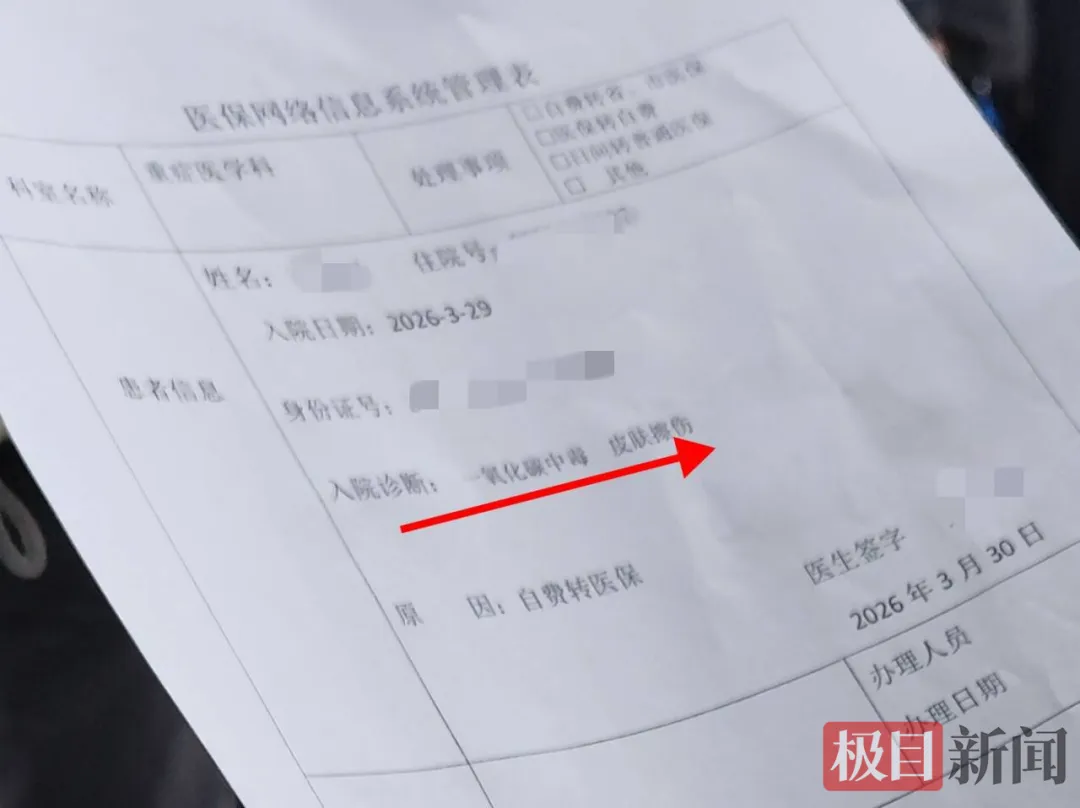 30日15时许,家属们在该医院ICU门口集合,等待探视。一名家属称,28日晚火灾发生前,他儿子在怡和巷烧烤炒菜店吃饭时遭遇此次事故。该家属领取的《医保网络信息系统管理表》显示,这名伤员入院诊断为一氧化碳中毒和皮肤擦伤。